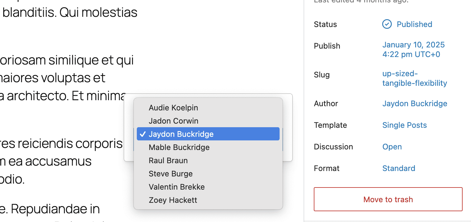 Third, you will see changes to the post editing screen. Inside the post editor, smaller sites have a dropdown area to choose the authors. You can see that dropdown in this screenshot below.