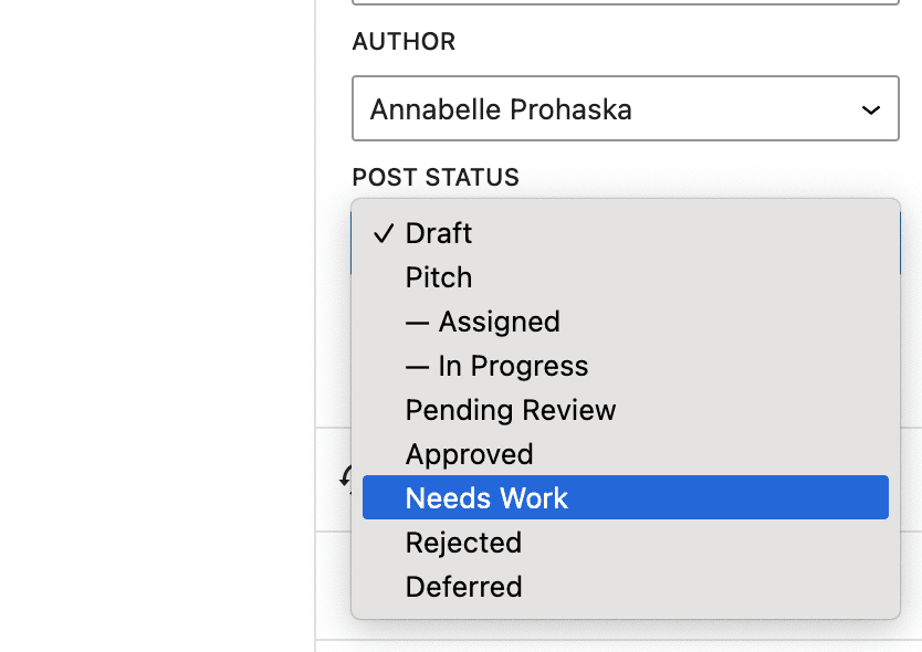 The “Alternate Workflow” contains statuses are that optional. This is used for statuses that do not lead to publication. Example statuses include “Needs Work”, “Rejected” and “Deferred”.