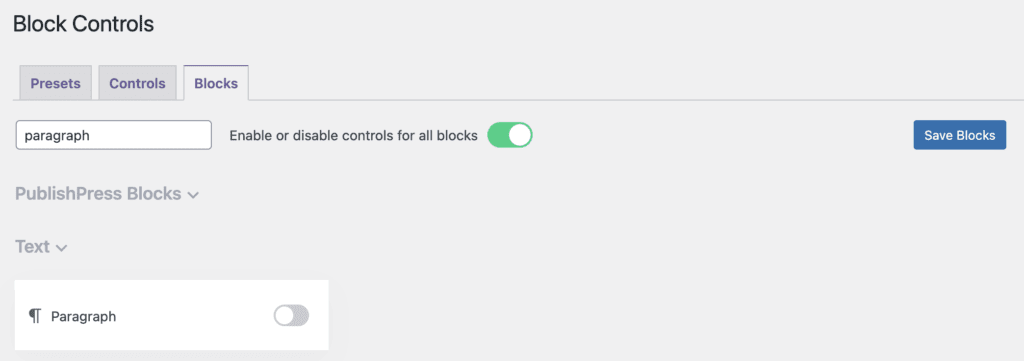 You can also enable or disable Block Controls per block type by going to “Blocks”, then “Block Controls” then visiting the “Blocks” tab.