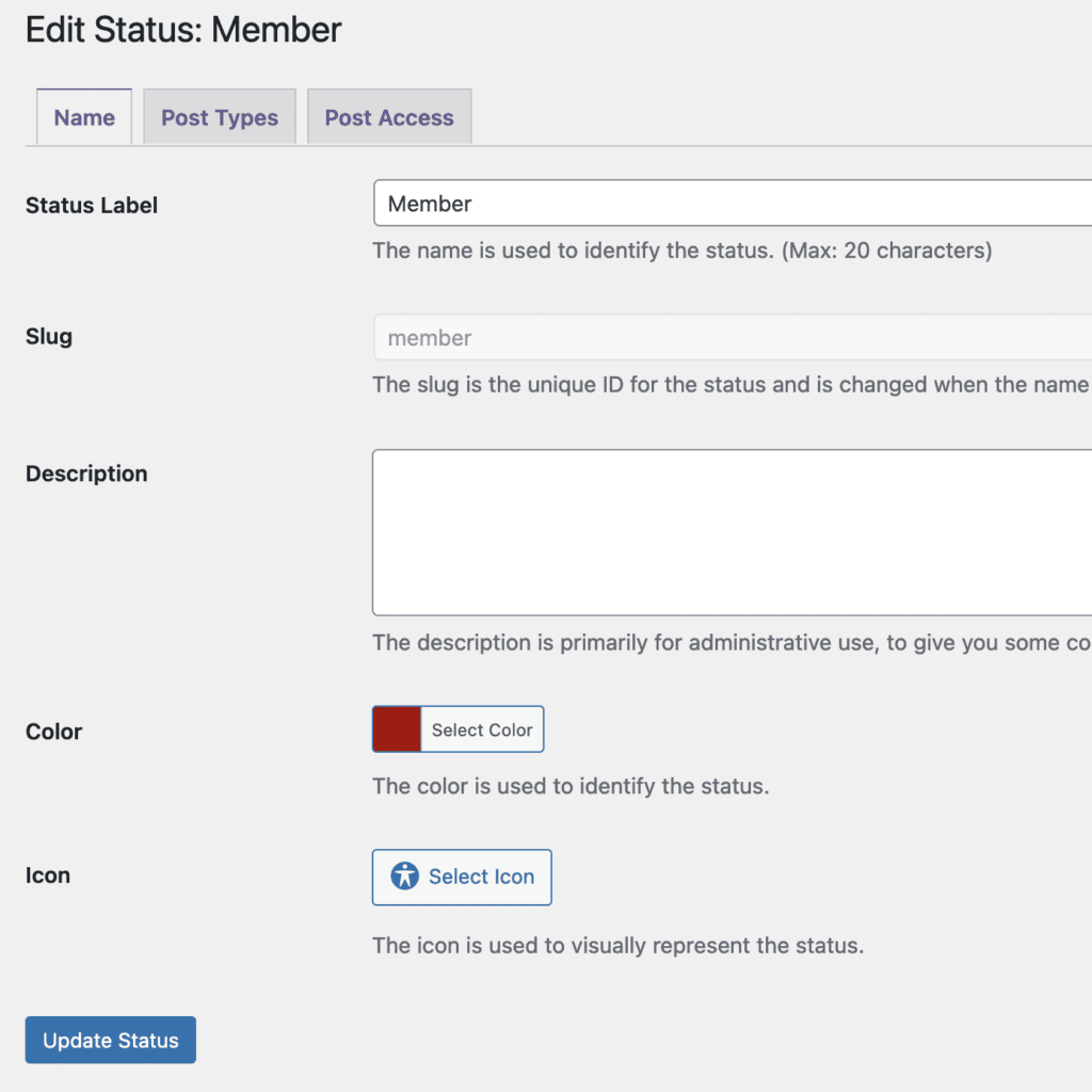 Click on “Member” and you'll be able to change the name of this status, and which post types it applies to: