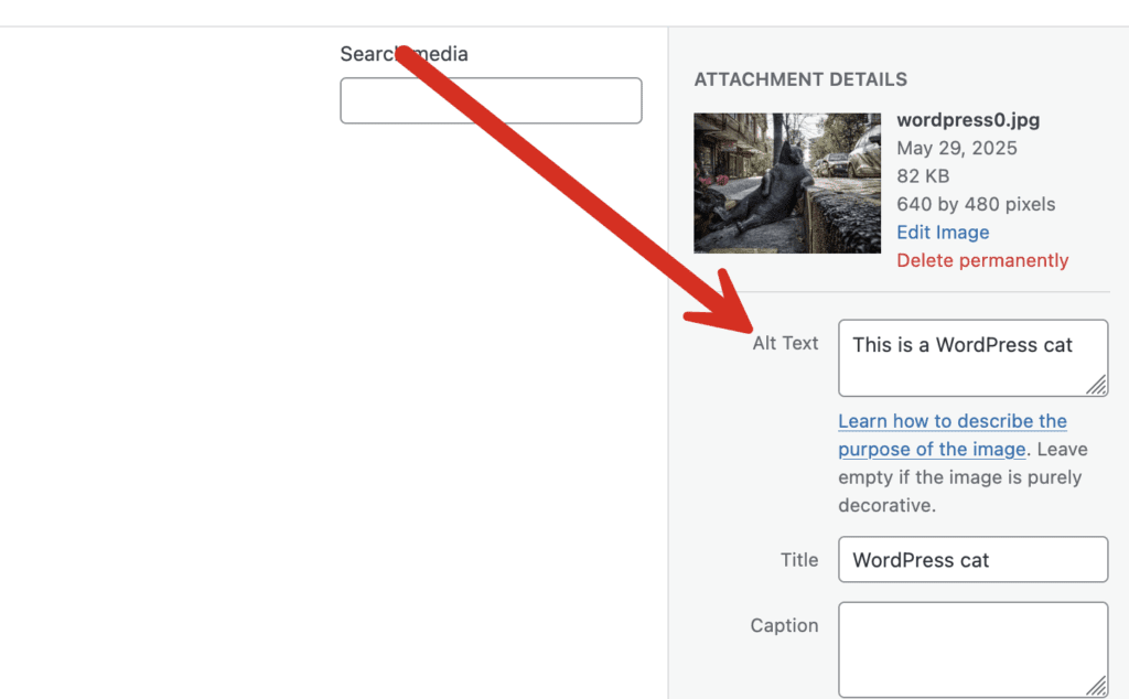 The Alt text for each image in WordPress can be set using the option shown in this screenshot: