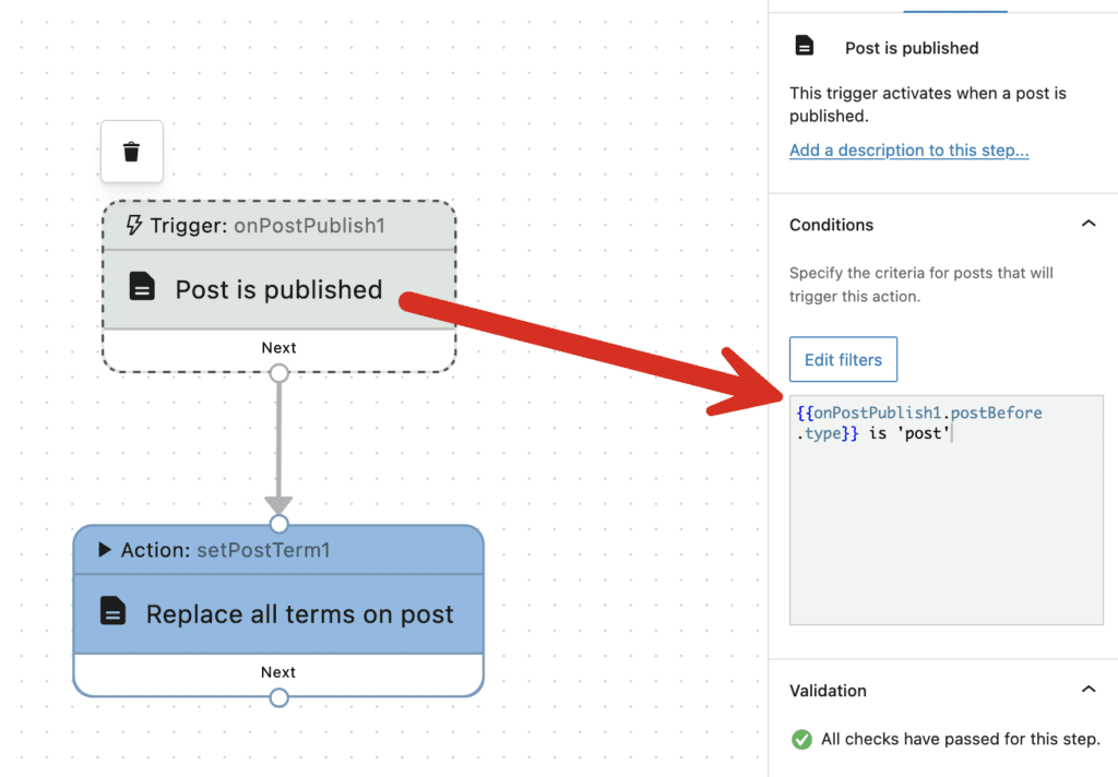 In the screenshot below a filter is set for the “Post is published” trigger. This workflow will only run only for Posts.