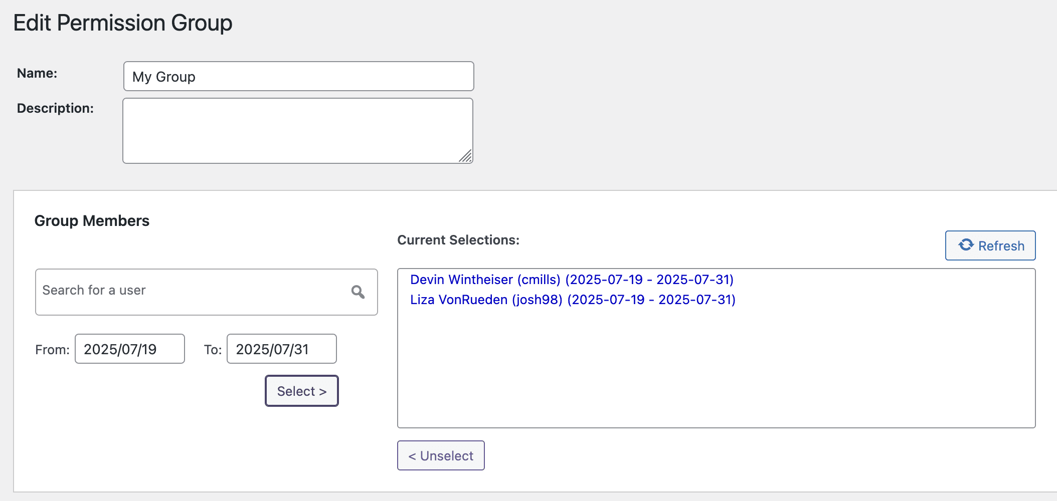 - In the bottom of the “Group Members” area, you can choose a “From” and “To” date for the group membership.