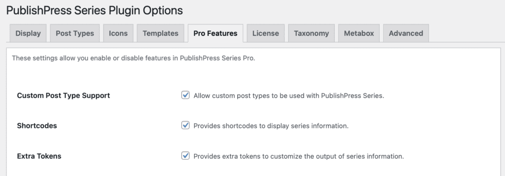 Extra tokens are available in the Pro version of PublishPress Series. This adds new tokens to the “Templates” screen for customizing the various series templates.