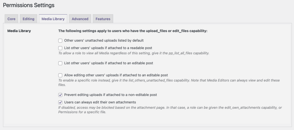 - Prevent editing uploads if attached to a non-editable post: If this boxed is checked, users can always edit media files if they are attached to a post that they can not edit.