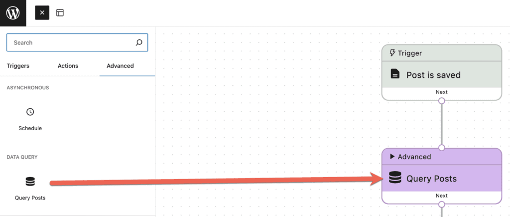 “Query Posts” is one of the steps available in the “Action Workflows” feature of the PublishPress Future Pro plugin. This step retrieves multiple posts to serve as the input for other steps. You can add a “Query Posts” step from the “Advanced” tab of the “Action Workflows” area.
