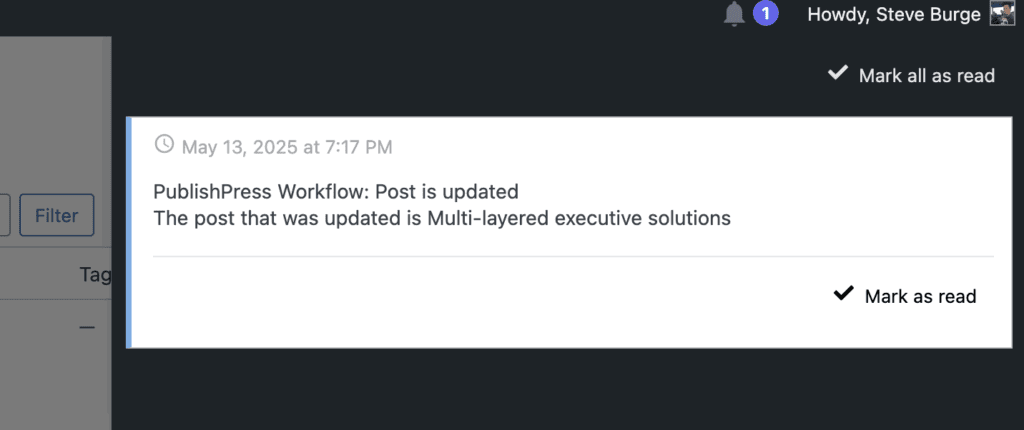 “Send in-site notification” is one of the steps available in the “Action Workflows” feature of the PublishPress Future Pro plugin. This step will send a customizable message that can be seen inside your WordPress site. In this screenshot below, you can see an alert notification: