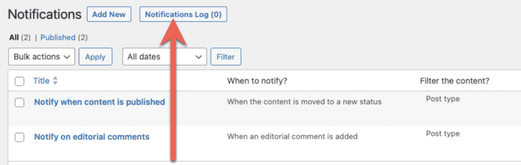 The Notifications Log allows you to see exactly who is getting which notifications. You can access the Notifications Log screen by going to Planner > Notifications in your WordPress admin area and clicking the “Notifications Logs” button.