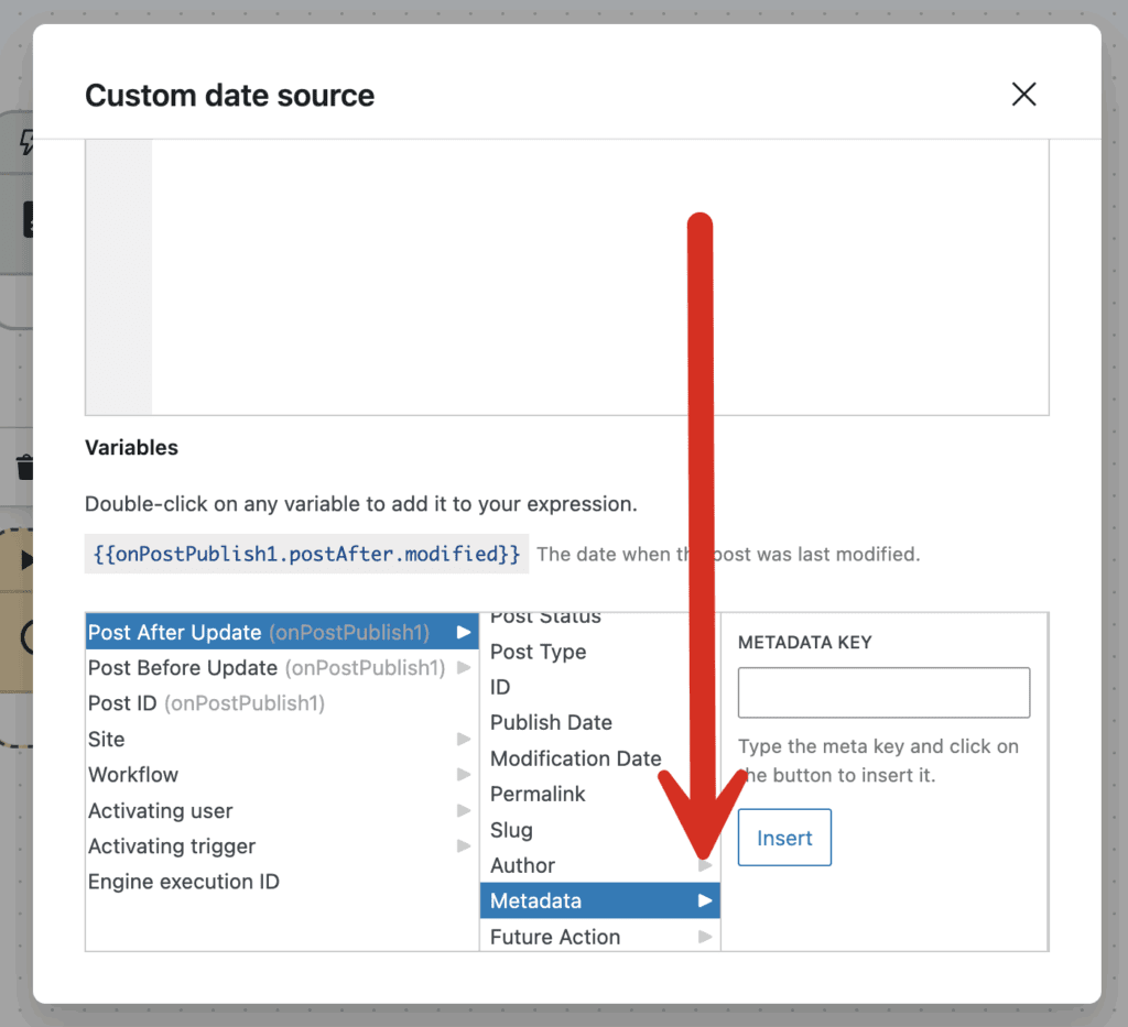 In the screenshot below, we're using the “Metadata” field as a date source. Because this is connected to a “Post” variable, this will look in the _postmeta table.